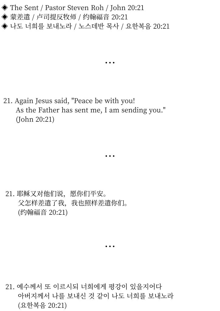 The Sent / 蒙差遣 / 나도 너희를 보내노라 11/09/2025 Steven Roh BICF Korean ◈ Youtube Link ☞ https://www.youtube.com/live/YiUG8I0iwak?si=PzzPkUjj2rOdGczz