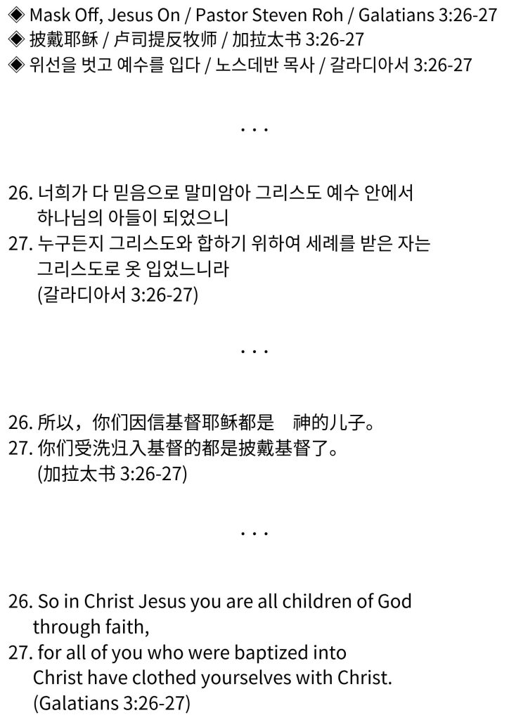 Mask Off, Jesus On / 披戴耶稣 / 위선을 벗고 예수를 입다 Yesterday Steven Roh BICF Korean ◈ Youtube Link ☞https://www.youtube.com/live/DqIOivJsLls?si=2j9g9qGZ3VGjmo9Z Post Views: 3